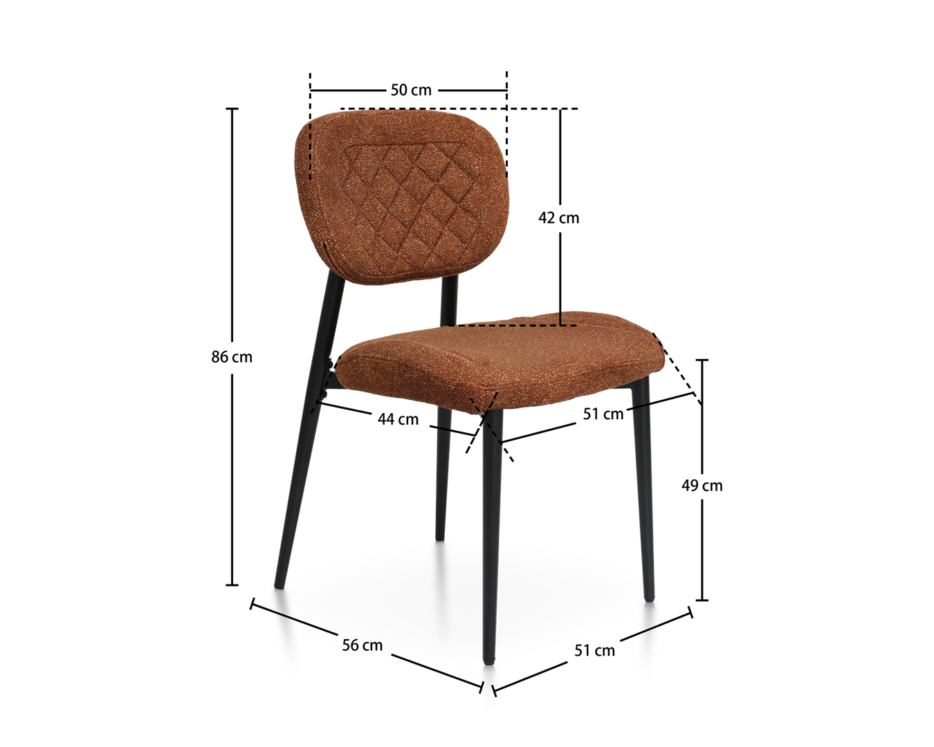 • A fekete fémkeret nemcsak robusztus stabilitást kínál, hanem szépen kiegészíti a gazdag barna kárpitozást. A szék kialakítása magában foglalja egy ívelt háttámlát és egy párnázott ülést, biztosítva a maximális kényelmet minden felhasználó számára. Függetlenül attól, hogy vacsorát rendez, vagy egyedül egy csendes ételt élvez, ez a szék emeli az étkezési élményt.