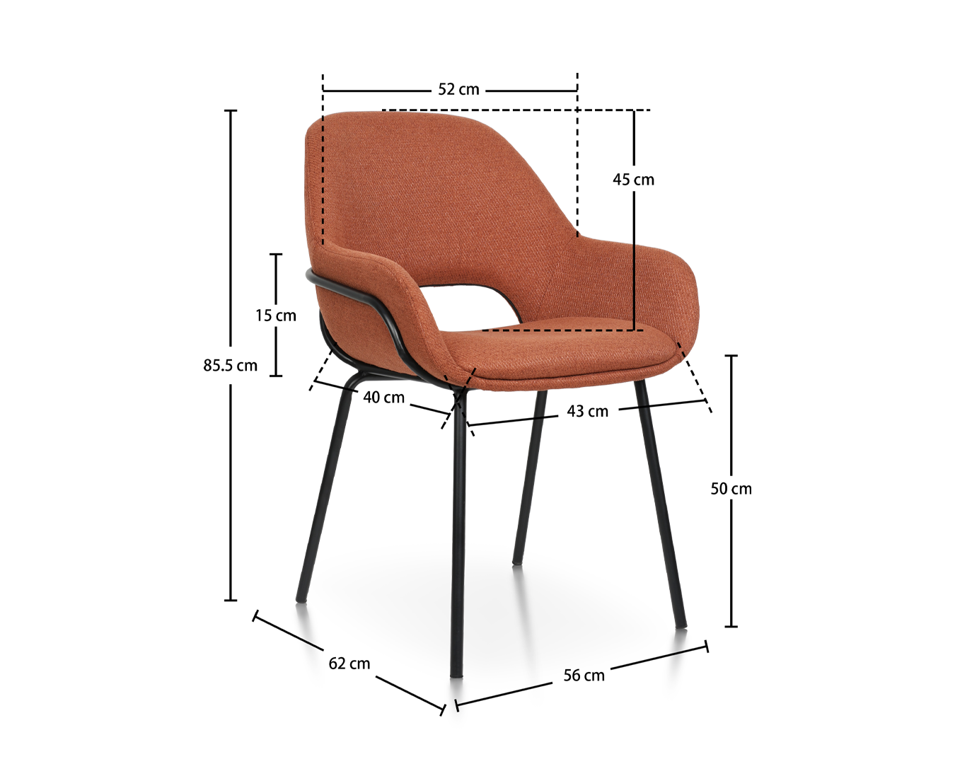 • A feltűnő fémbázissal és a puha szövet gyönyörű keverékével ez a szék elegáns hangulatot kínál, miközben optimális kényelmet biztosít a hosszú, nyugodt vacsorák számára. Az ergonómiai kialakítás és az 50 cm -es ülésmagasság ideális étkezési élményt nyújt, míg az erős keret tartós tartósságot biztosít.