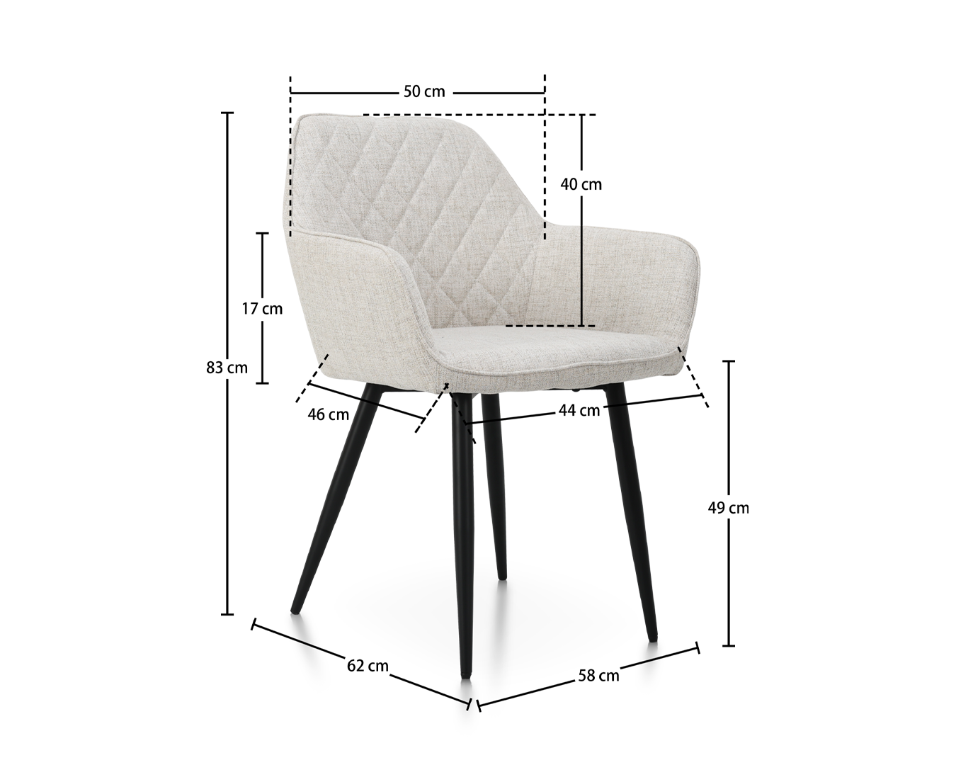 • Erős vaskerettel készítve, amely biztosítja a tartósságot és a stabilitást. Az ülés és a háttámla nagy sűrűségű habbal van párnázva a kivételes kényelem érdekében, így ideális a hosszú vacsorabeszélgetésekhez vagy az alkalmi családi étkezéshez. A kárpit egy kiváló minőségű anyagból készül, amely nemcsak hozzáadja az eleganciát, hanem kiváló kopási ellenállást is biztosít, biztosítva, hogy a szék az elkövetkező években tiszta állapotban maradjon.